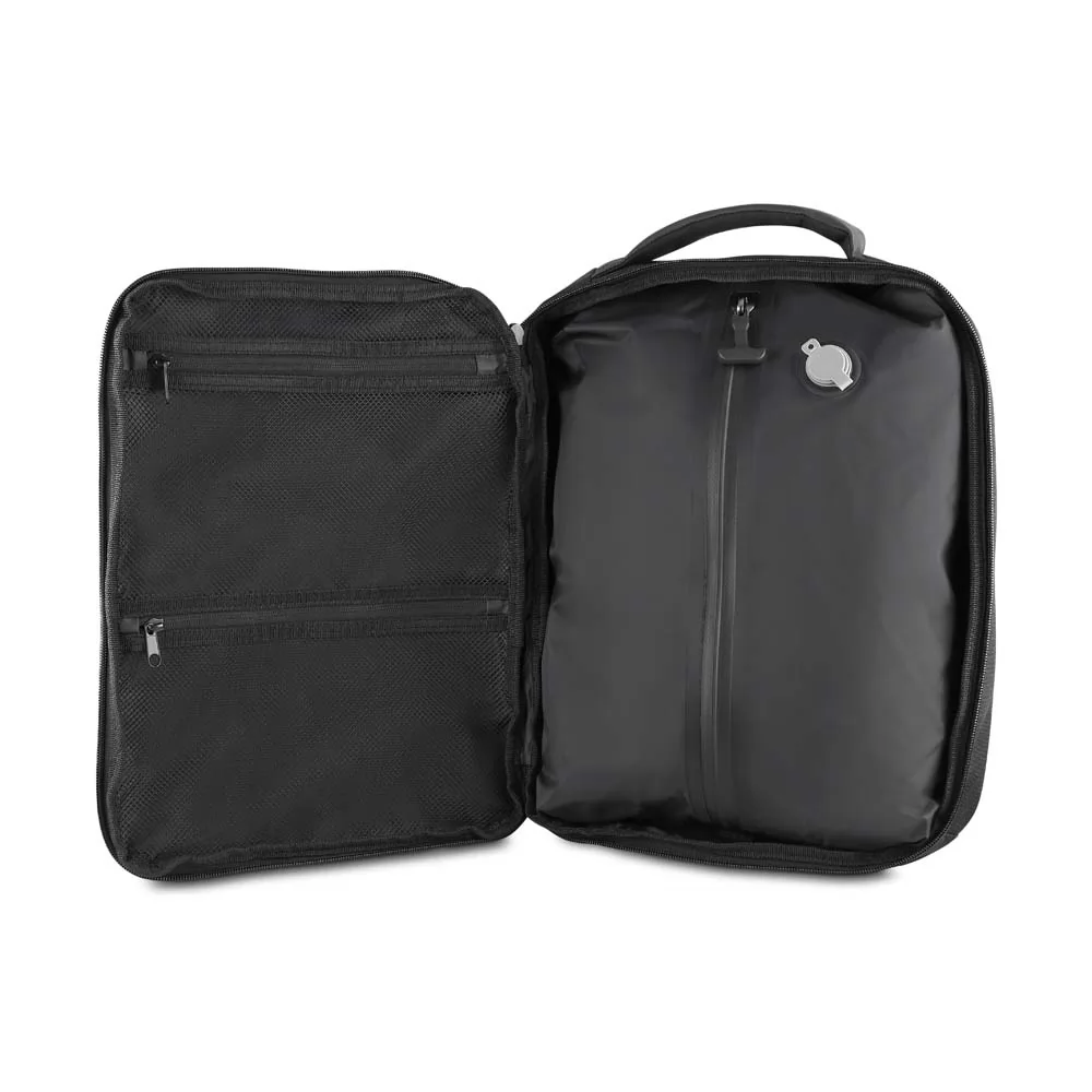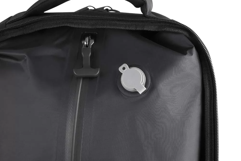 Mochila premium em poliéster 600D com detalhe em PU e interior em poliéster 210D. Conta com compartimento interno a vácuo, acompanha bomba para desinflar, expansor com zíper, compartimento frontal com zíper, compartimento para notebook de até 15,6”, compartimento com zíper nas costas, engate para mala de viagem e alças de mão e ombro acolchoadas.
